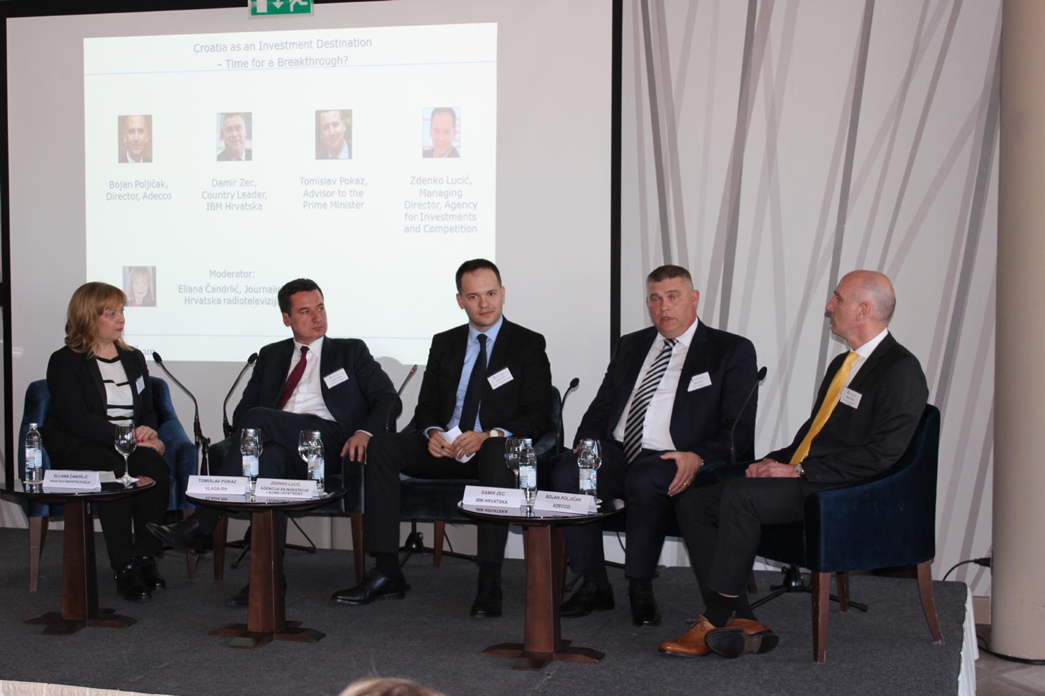 The panel discussion “Croatia as an Investment Destination – Time for a Breakthrough?”, moderated by Eliana Čandrlić, included distinguished guests from both public and private sector: Tomislav Pokaz (Government of the Republic of Croatia), Zdenko Lucić (Agency for Investments and Competitiveness), Damir Zec (IBM Hrvatska), and Bojan Poljičak (Adecco).